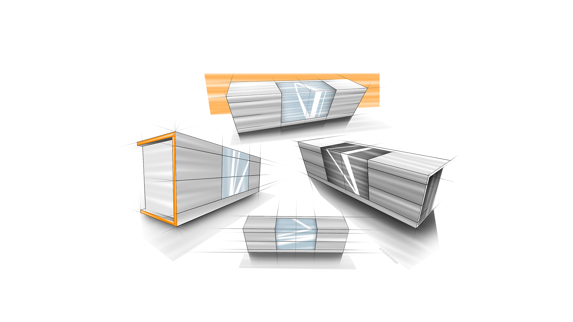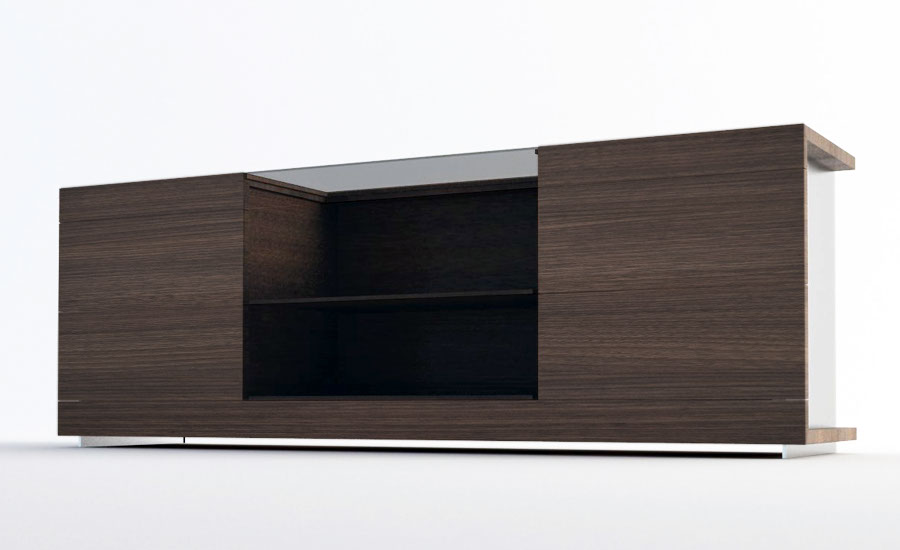 The essential and minimalist design is studied to ensure proper functionality of two drawers with hidden runners with full extension and two side pockets with flap opening directly from the top. All expertly masked when closed through 45 degree cuts and a perfect combination of iron/wooden materials.